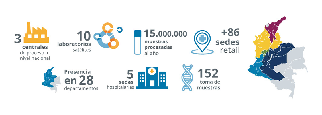 Tenemos presencia en 28 departamentos del país con más de 152 sedes, 5 sedes hospitalarias y 3 centrales de proceso a nivel nacional, 1 laboratorio central de Patología, 10 laboratorios satélite que a través de una extensa red logística garantiza una Medicina de Laboratorio de alta calidad para todos los colombianos. Para cumplir este propósito, contamos con más de 1.300 colaboradores que trabajan día a día prestando un servicio de excelencia centrados en la salud y el bienestar de los pacientes que atendemos.